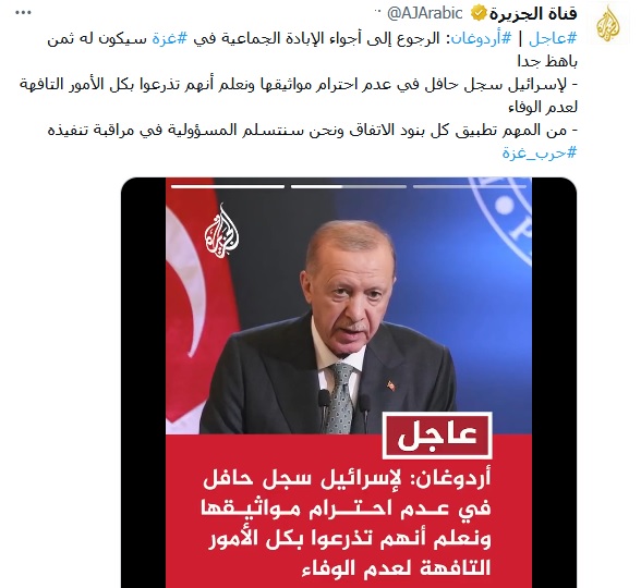 حذر الرئيس التركي رجب طيب أردوغان من العودة إلى أجواء الحرب مرة أخرى، مؤكداً على أن عودة أجواء الإبادة الجماعية مرة أخرى سيكون ثمنها باهظ، وأشار الرئيس التركي إلى أن إسرائيل لها سجل حافل في نقض المواثيق وأنهم دائماً يتزرعون بأمور تافهة لنقض المواثيق وعدم الإلتزام بالإتفاقيات.