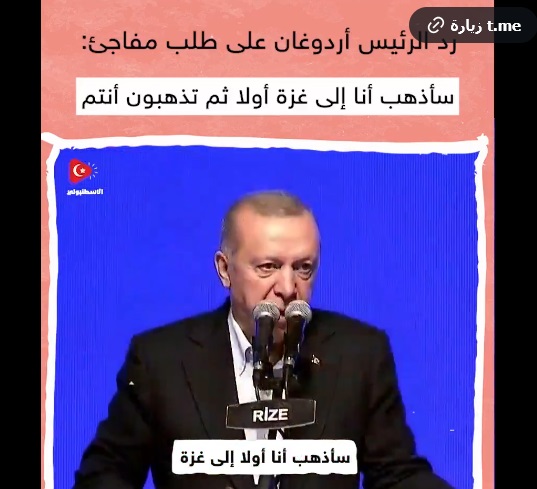 وفي سياق متصل وأمام جمع كبير من المواطنين الأتراك، هتف الأتراك مناشدين رئيسهم رجب طيب أردوغان بالذهاب إلى غزة، ففاجأهم أردوغان قائلاً لهم أنا سأذهب أولاً إلى غزة وبعدها تذهبون أنتم.
