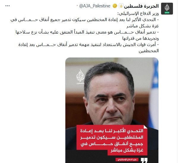 أدلى وزير الدفاع الإسرائيلي قبل قليل بتصريحات خطيرة، تدل على أنها ستعاود الحرب مرة أخرى بعد استلامها لأسراها خلال الساعات المقبلة، وربما تكون عودة الحرب بمباركة أمريكية أوروبية، وذلك كما حدث قبل ذلك مع إيران، حيث تم استهدافها أثناء المفاوضات.