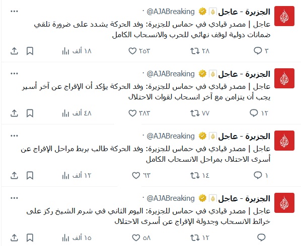 إلا أن المقاومة الفلسطينية وضعت شروط واضحة وحاسمة لإنهاء الحرب والإنسحاب الإسرائيلي الكامل من غزة، وقالت حماس بأن وفد الحركة أكد على أن الإفراج عن آخر أسير إسرائيلي يجب أن يتزامن مع آخر انسحاب من غزة، وشددت حماس على ربط مراحل الإفراج عن الأسرى بالإنسحاب الكامل للإحتلال.