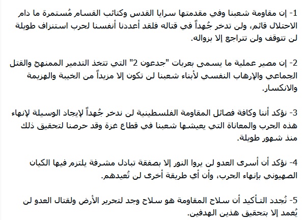حيث أكدت سرايا القدس، على أن أسرى إسرائيل لن يروا النور إلا من خلال صفقة تبادل يلتزم فيها العدو بإنهاء الحرب والإنسحاب الكامل من القطاع، كما أكدت حركة حماس وسرايا القدس على أن سلاح المقاومة وجد من أجل قتال العدو وتحرير الأرض، ولن يتم إغماد السلاح إلا بزوال الإحتلال وتحرير فلسطين كاملة.